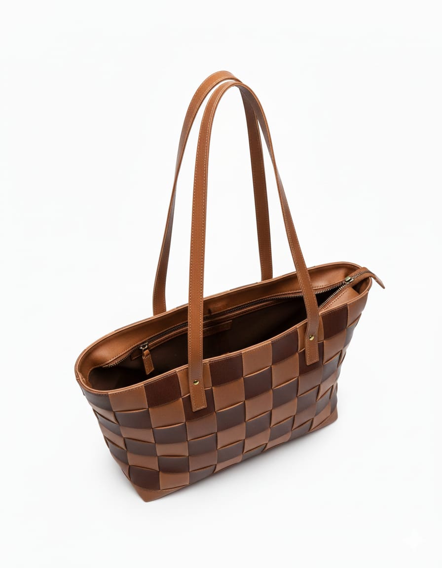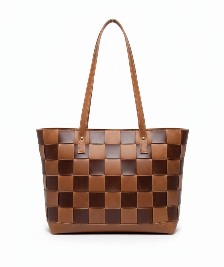 Feature & Details Material: 100% Genuine Cow Leather Technique: Hand-woven / Braided ("Breed") Construction Hardware: Brushed Brass Accents Colorway: Two-Tone Honey & Dark Earth Occasion: Work, Weekend Brunch, or Urban Travel Style Tip: The bold geometric pattern makes this the perfect statement piece for a minimalist outfit. Pair it with a neutral trench coat or a crisp white linen shirt to let the texture pop.