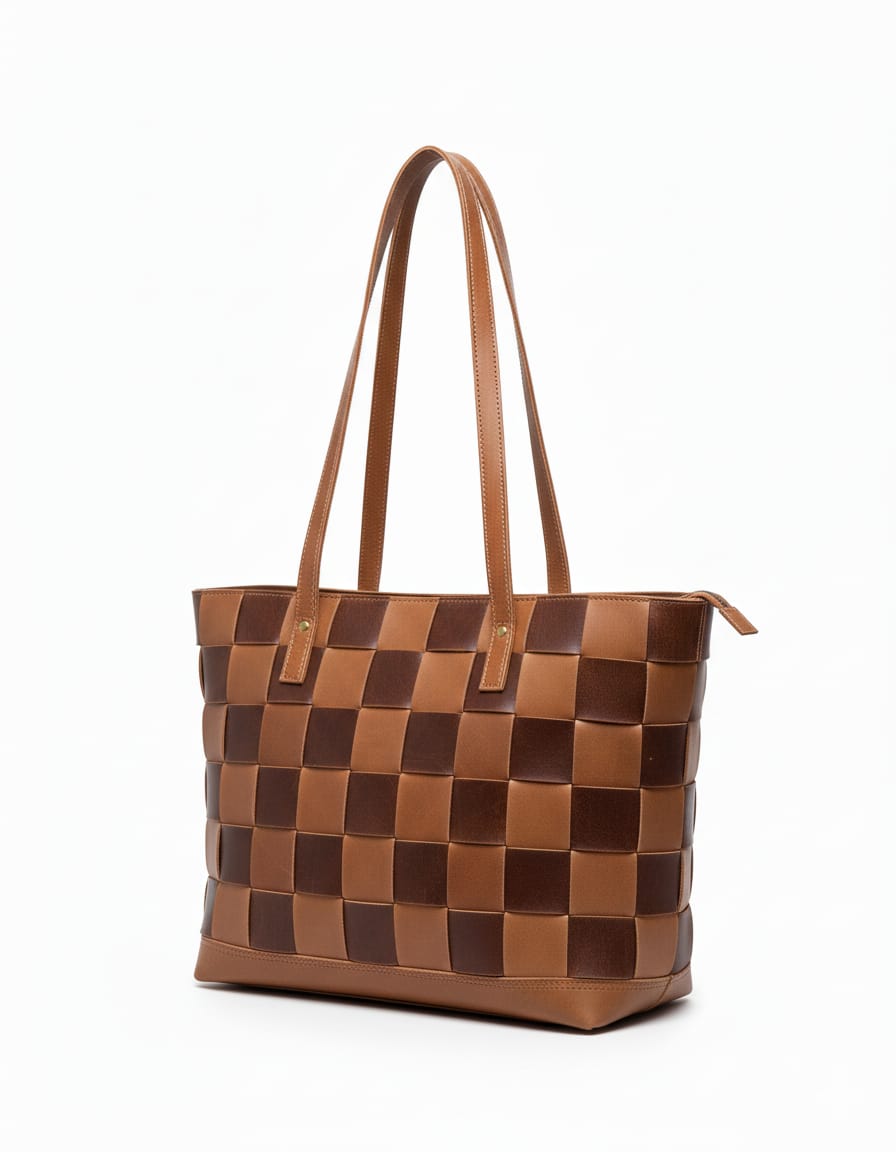 Elevate your daily ensemble with a bag that celebrates the art of hand-weaving. This “breed” style tote features an intricate interlaced design using dual-toned cow leather, creating a striking checkerboard pattern that is as durable as it is stylish.